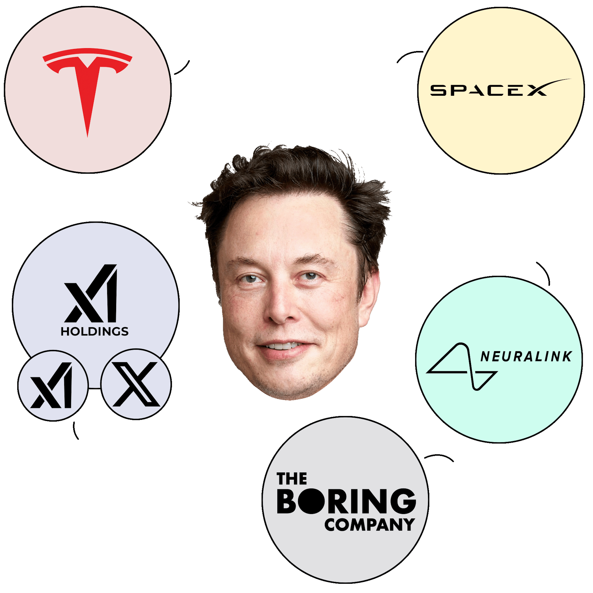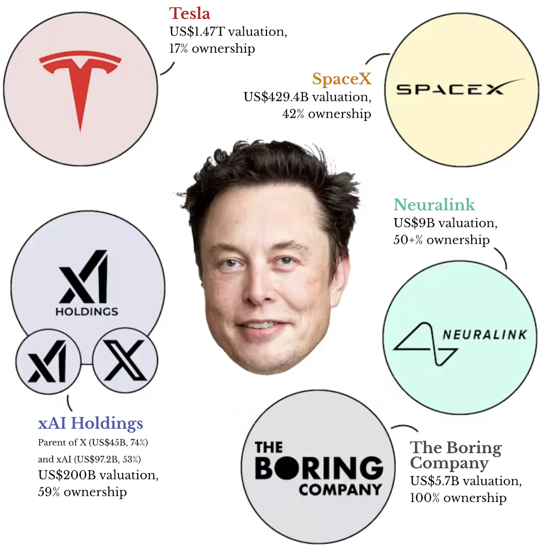 His fortune comes from a 12% stake in Tesla, 42% of aerospace company SpaceX, and ownership of X, the social media platform he acquired as Twitter in 2022 for $44 billion. He later merged X with his AI start-up xAI, valuing the combined business at US$113 billion (A$174.21 billion). He also has financial interests in Neuralink and The Boring Company.